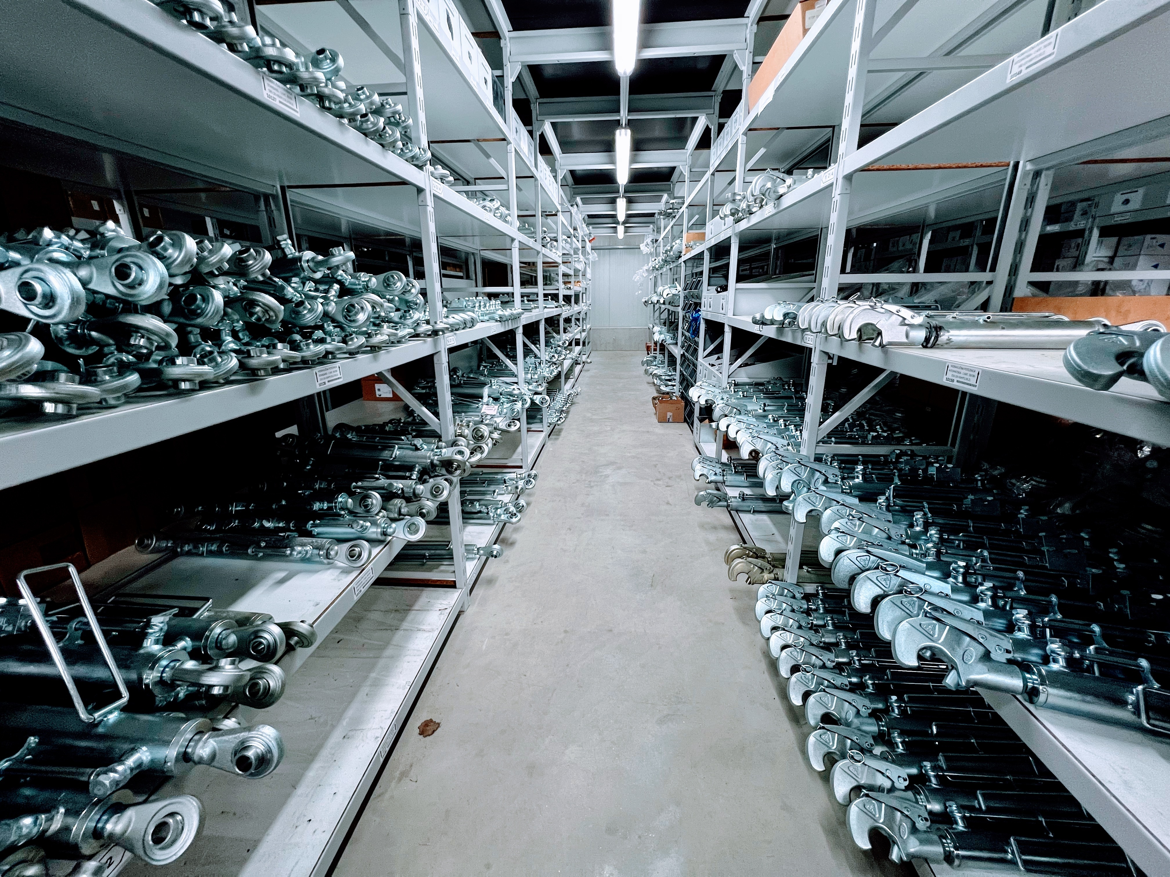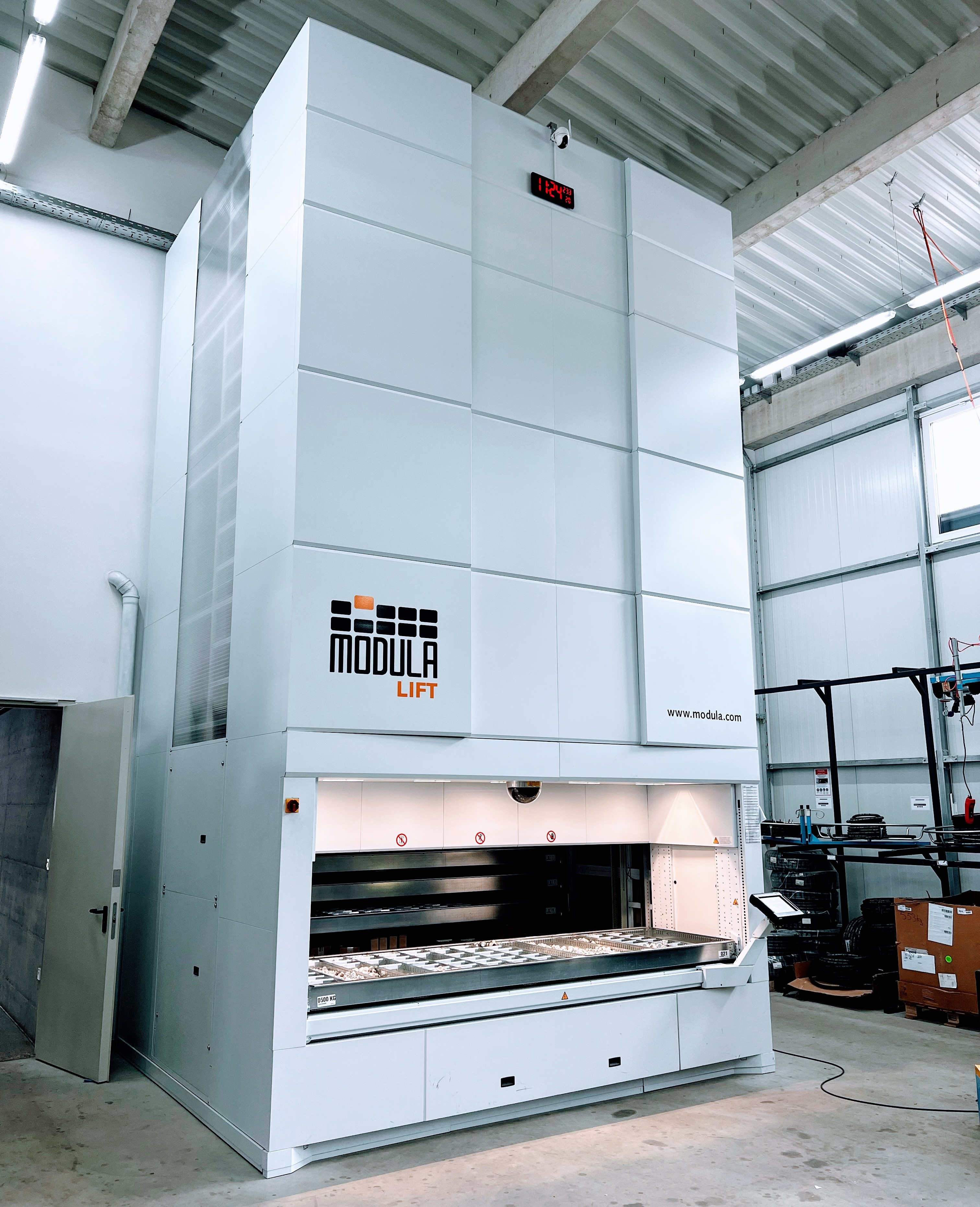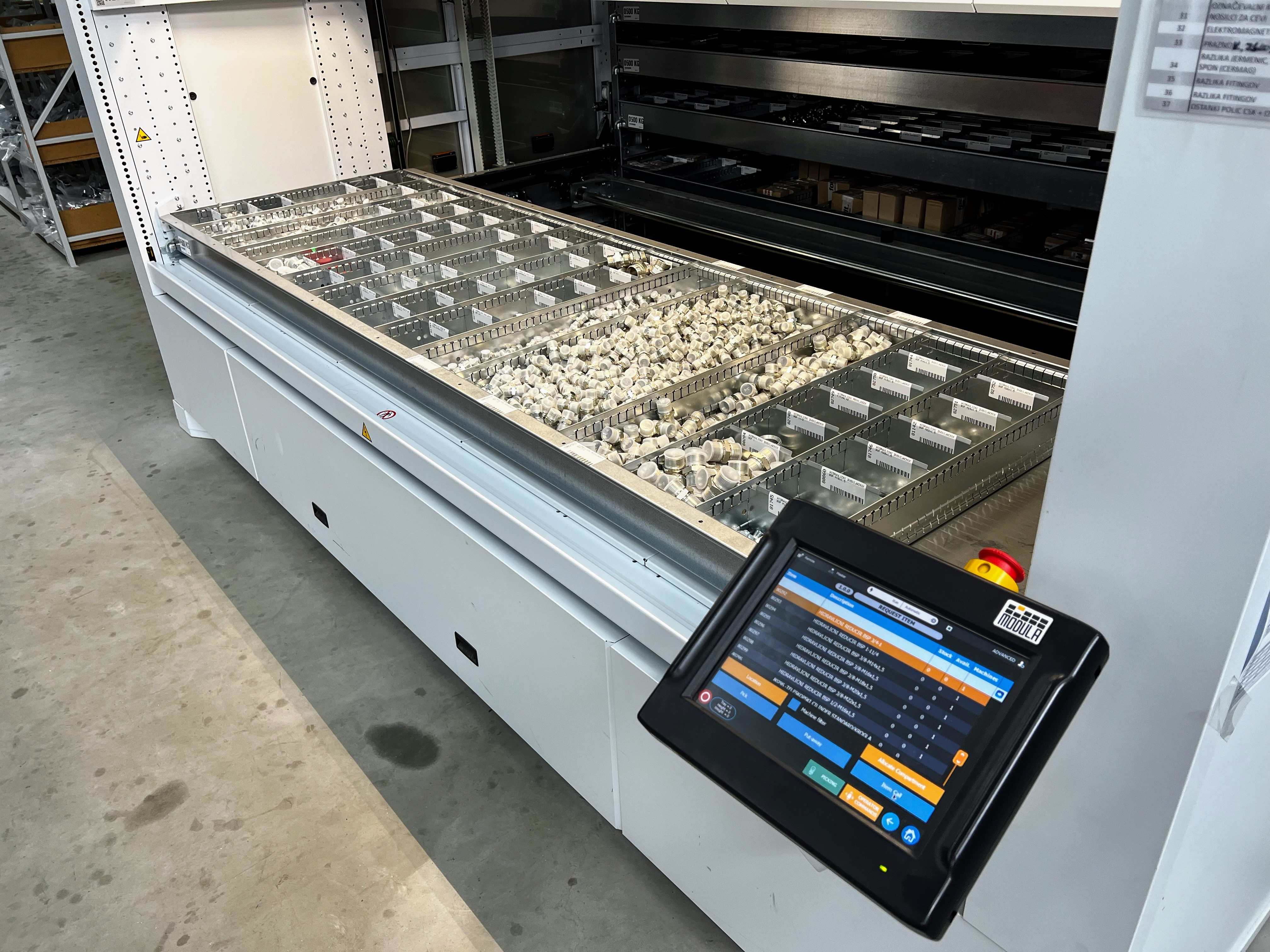 Per i piccoli componenti utilizziamo un “magazzino intelligente” (Modula). Gli articoli sono organizzati per codice in vassoi con molti scomparti. Inserendo un codice sullo schermo, il sistema consegna in pochi secondi il vassoio corretto e indica lo scomparto con un laser. Il sistema è integrato con l’inventario, quindi le giacenze restano sempre aggiornate. Questo è particolarmente utile per i raccordi, poiché ogni giorno assembliamo molti tubi idraulici personalizzati con connettori diversi alle estremità.