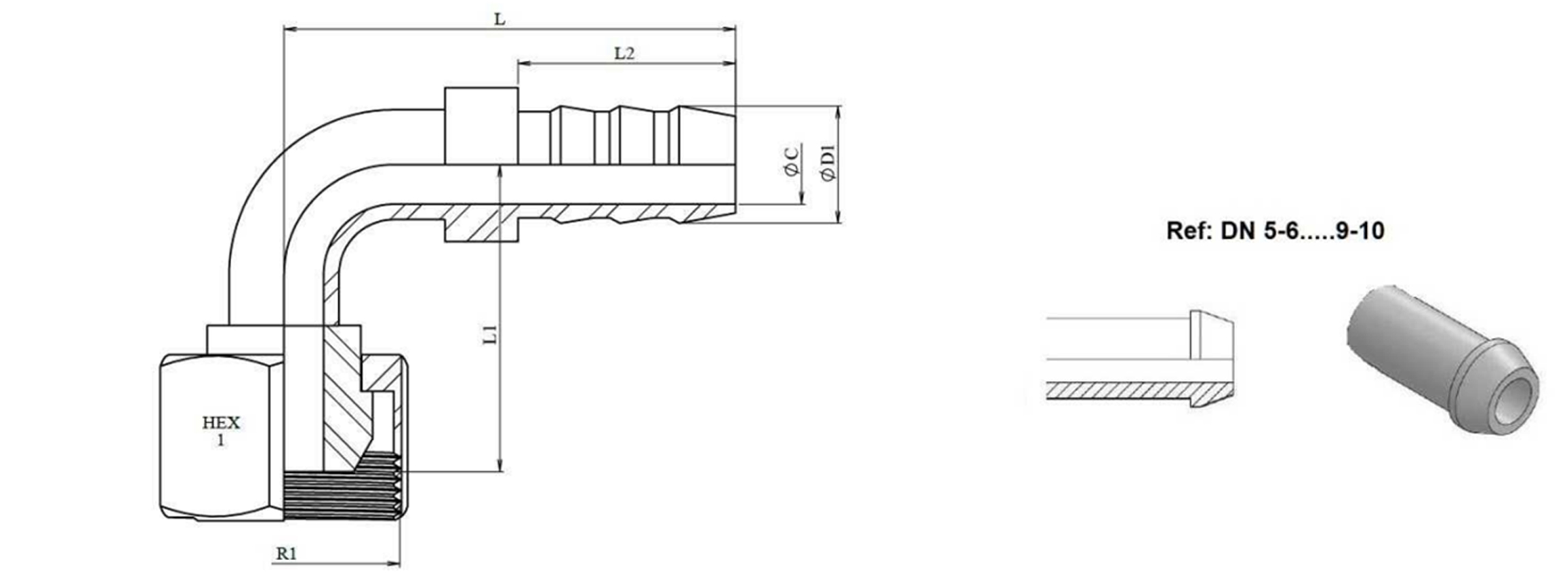 HYDRAULISK HUNN KOBLING 1 BEND 90° FOR GUMMISLANGE Φ 25